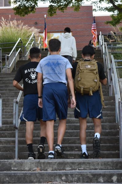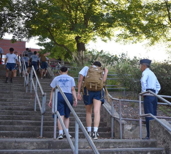 The historical attack on 9/11 changed the world in many ways, and 2,977 lives were lost as a result of four planes hijacked by terrorists. Many first responders rushed into the Twin Towers in New York City with the mission to save people, and more than 400 did not make it out alive. In honor of all the lives lost, the leaders of AFJROTC decided to do a memorial stair climb. The cadets climbed the staircase near the track 40 times, which is equivalent to the amount of stairs in the Twin Towers. Teams of cadets alternated carrying 30-pound rucksacks to represent the equipment that first responders carried while climbing the stairs.